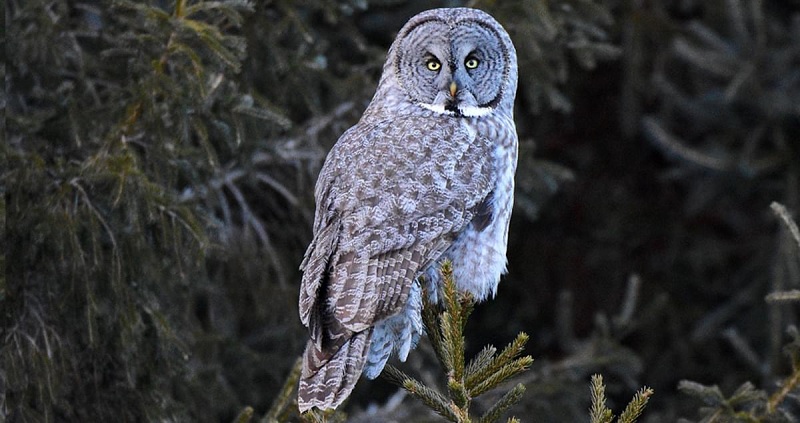 Unlike many other owls, the great grey owl lacks prominent ear tufts. Its plumage is a mottled mix of grey, white, and brown, which provides excellent camouflage in the snowy boreal forests it calls home. The dense feathers around its neck give the owl a “fluffy” appearance that enhances its already impressive size.