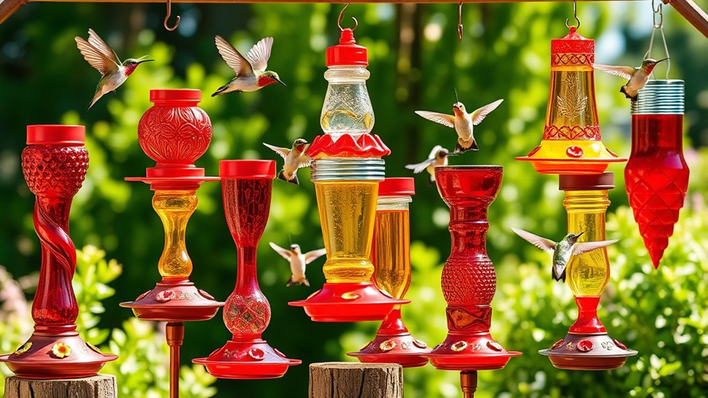 Although hummingbirds are naturally drawn to vibrant colors, you can boost their visits by choosing feeders with bright red accents that mimic flowers. Look for feeders featuring multiple feeding ports with perches, so hummingbirds can comfortably rest and feed longer. Decorative artwork or elements on the feeder also enhance its visual appeal, attracting more birds.