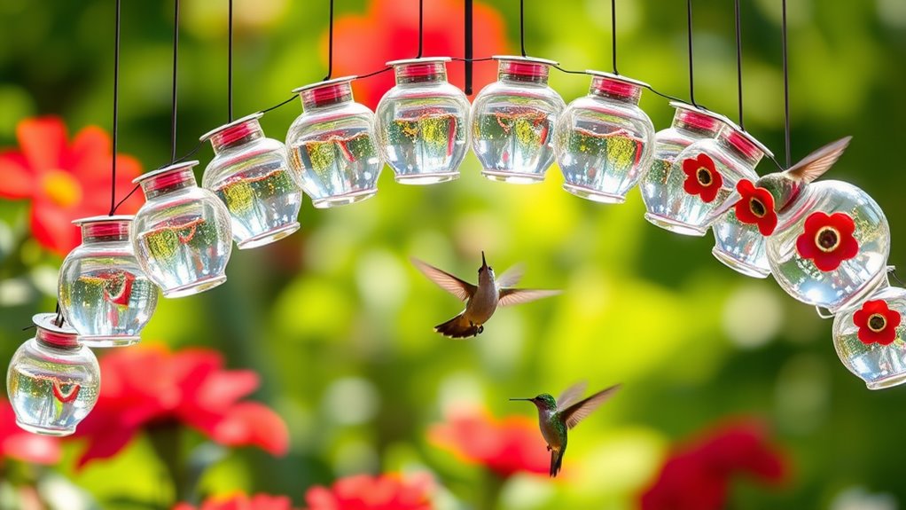 Decorative designs, like glass bottles with artwork, add aesthetic appeal to your yard while still catching birds’ eyes. Increase visual activity with multiple feeding ports and perches, creating more movement and opportunities for interest from a distance. Overall, color contrast and attractive shapes matter most, guiding attention and encouraging hummingbirds to explore your feeder before others.