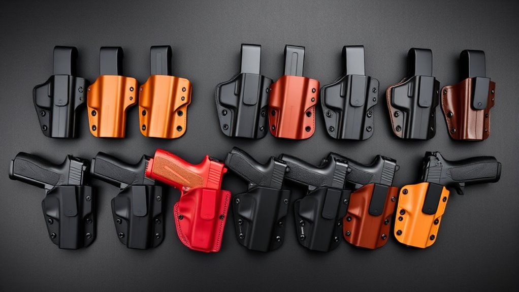 Some holsters offer customizable retention systems, letting you adjust the fit based on your firearm’s accessories, guaranteeing security. Always check the holster’s specifications carefully to confirm it matches your accessory setup for peak performance.