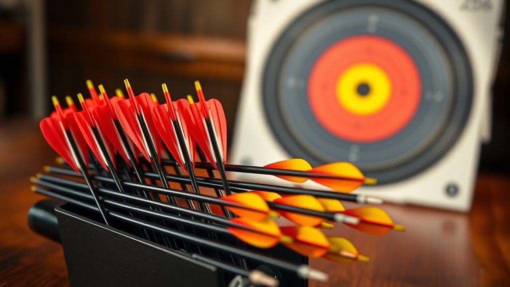 Stainless steel components, especially inserts, add toughness against repeated impacts and storage stress. It’s vital to pick materials that won’t crack, split, or bend easily under pressure, so your arrows maintain consistent performance. By focusing on these durability factors, you’ll ensure your 204 arrows remain reliable and precise, no matter the conditions you face during your shooting sessions.