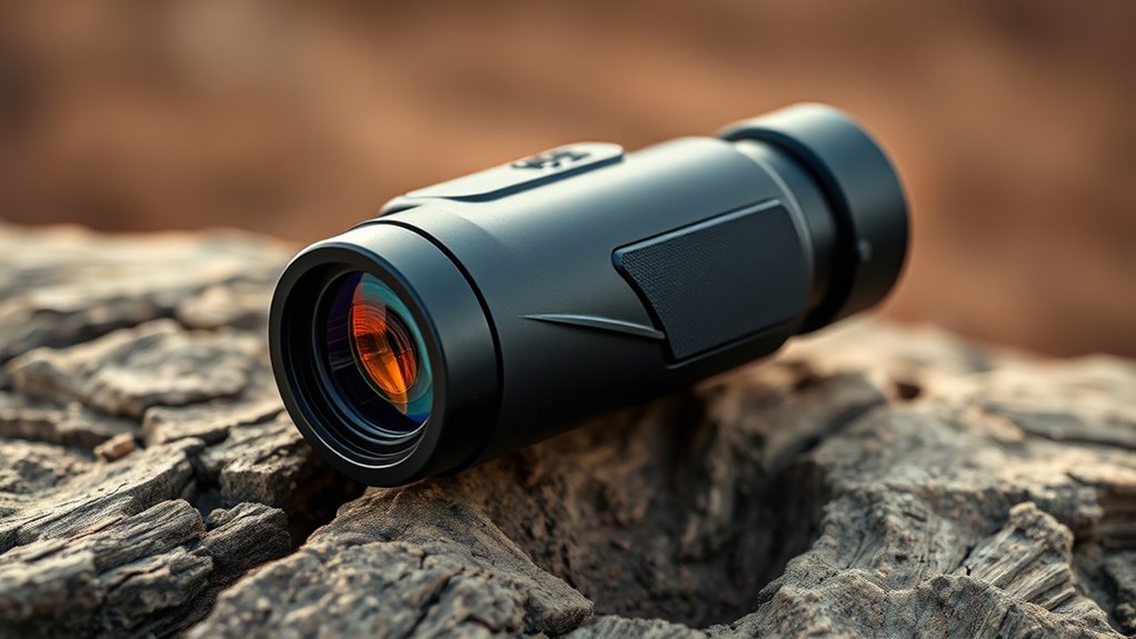 Also, check the operating temperature range—ideally from -20°C to 50°C (-4°F to 122°F)—so your monocular performs reliably in extreme climates. Prioritizing durability and weatherproofing guarantees your thermal monocular stays functional and tough, no matter where your adventures take you.