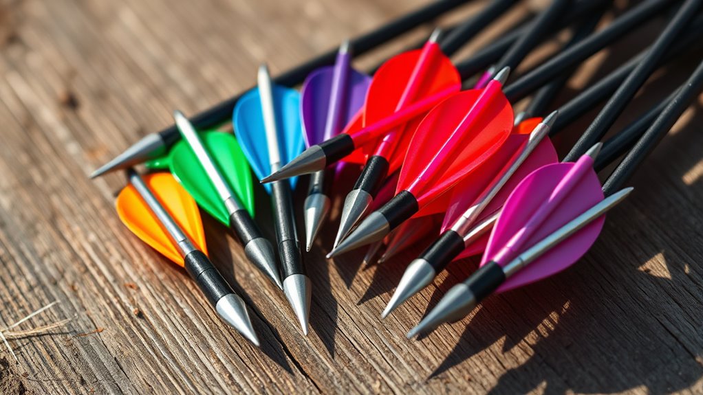 On the nock side, choose adjustable or replaceable models to fit various bowstrings securely. Proper nock orientation is essential—it stabilizes arrow flight and reduces erratic trajectories at release. Paying attention to these tip and nock features guarantees your arrows perform reliably in every shot.