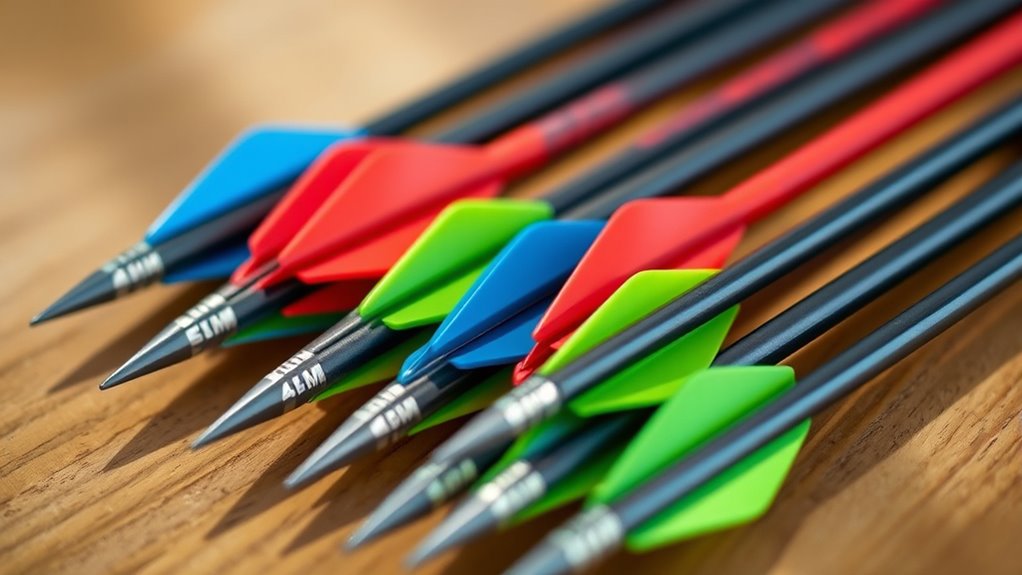 Choosing the right inserts and points sets the foundation for your arrow’s performance, but flight stability features determine how consistently your 4mm arrows fly. Look for arrows with tight straightness tolerances—±0.003 inches or better—to guarantee consistent flight paths.