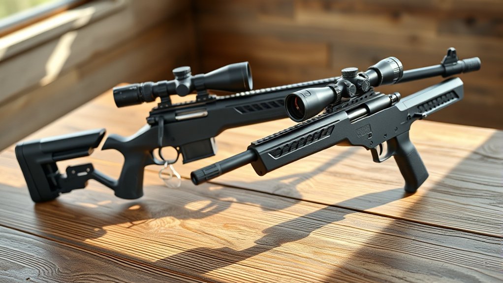 Ergonomics, including stock and grip design, guarantee you stay comfortable and steady when aiming and firing. Proper balance and weight distribution reduce strain and improve accuracy, so choose a rifle that feels natural and well-fitted to your shooting style.