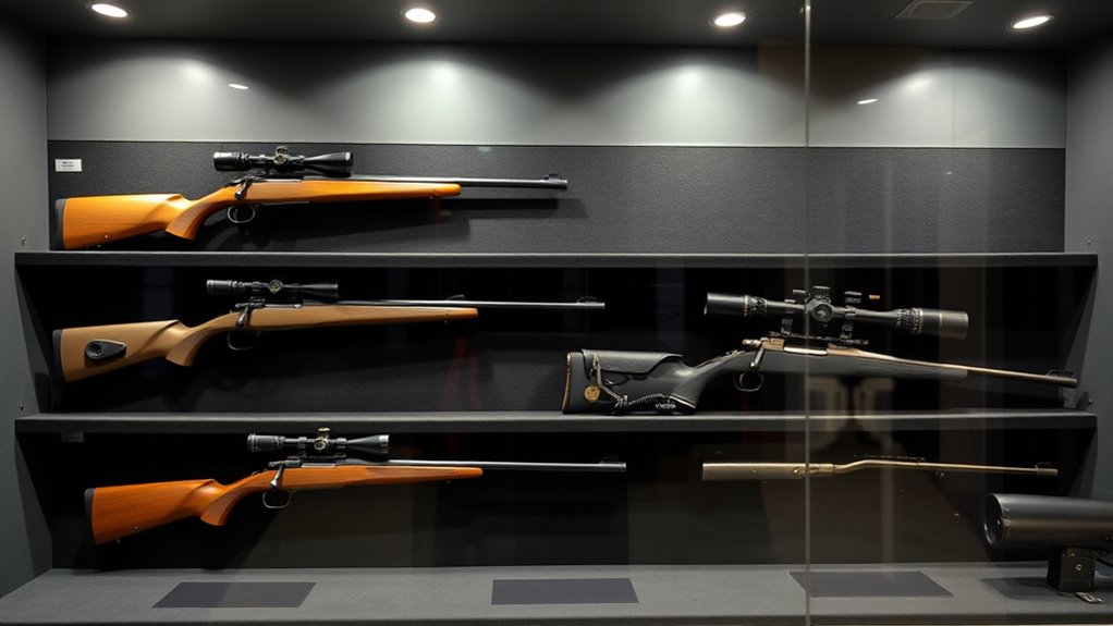 The stock and grip design directly affect how easily you aim and stabilize the rifle, influencing your accuracy. Lightweight, compact models offer better maneuverability in field conditions without sacrificing power or stability. Ergonomic considerations also cover safety and loading controls—accessible safeties and intuitive loading mechanisms promote safe, efficient operation.