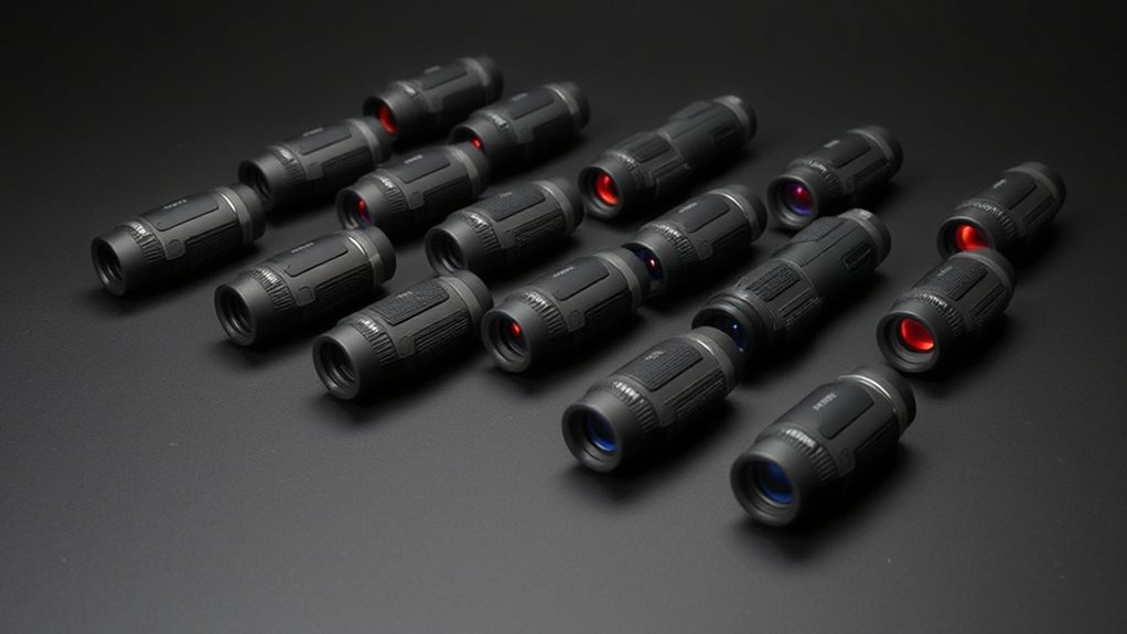 Higher magnification helps reveal finer details but narrows your field of view, making it harder to track fast-moving or wide-area targets. You’ll want to balance zoom capabilities based on your needs, whether you prioritize close-up detail or broad scanning for efficient target acquisition.