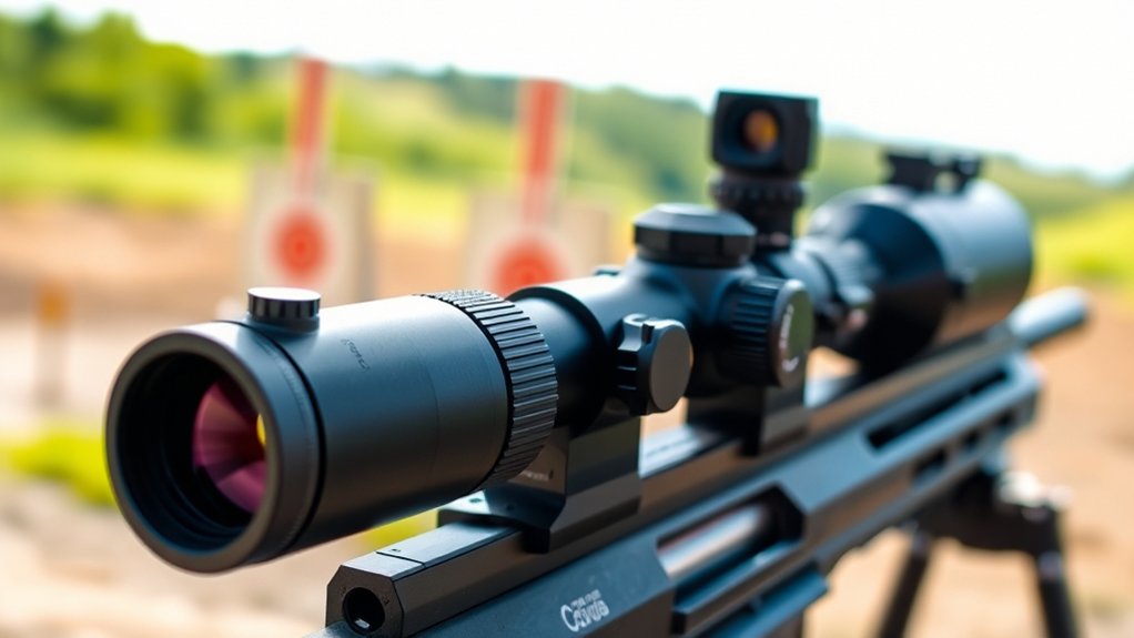 Conversely, lower minimum magnification offers a broader field of view, making target acquisition easier in fast-paced or wide-area situations. Balancing magnification range with ease of use and stability guarantees your scope performs well in diverse lighting and environmental conditions.