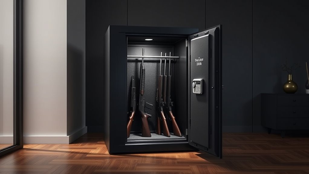Although choosing an 8 gun safe can seem straightforward, prioritizing security features is essential to protect your firearms effectively. Look for safes that offer multiple access methods, like biometric fingerprint scanners, digital keypads, and backup keys, so you can get quick access even in emergencies.