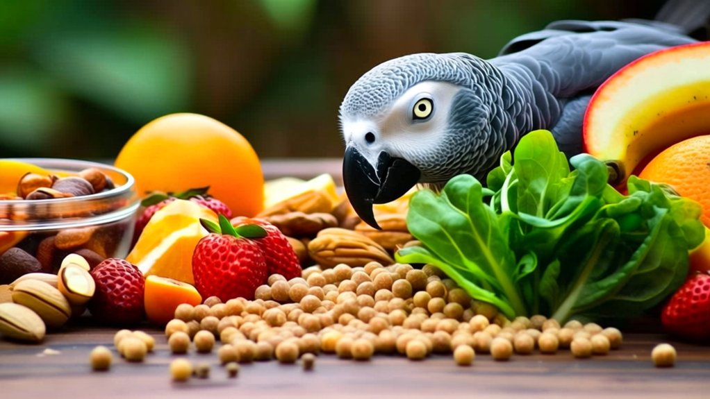 Because African Grey parrots rely on a nutrient-rich diet to thrive, you’ll want to focus on foods that support their heart health, feather condition, and cognitive function. Choose a balanced mix of pellets, seeds, and fresh fruits and vegetables rich in vitamins A, D3, and E to keep their feathers vibrant and skin healthy.