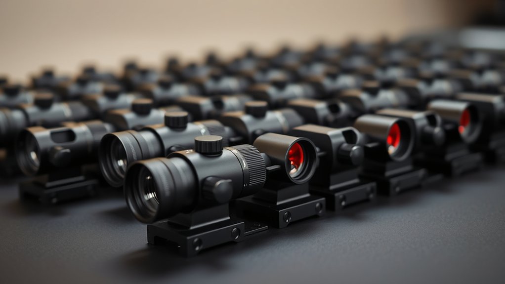 Lightweight designs ensure comfort in extended sessions, while some combos include magnifiers for versatility at various ranges. Keep exploring, and you’ll discover which sight matches your exact shooting needs.