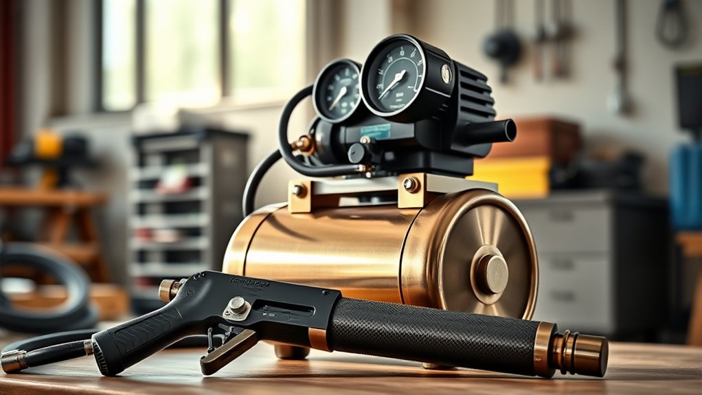 You’ll want a durable, corrosion-resistant air compressor delivering consistent 60-160 PSI airflow to maximize your Tornador gun’s vortex cleaning power. Look for models with adjustable regulators, quick-connect fittings, and quiet operation around 70 decibels to reduce fatigue.