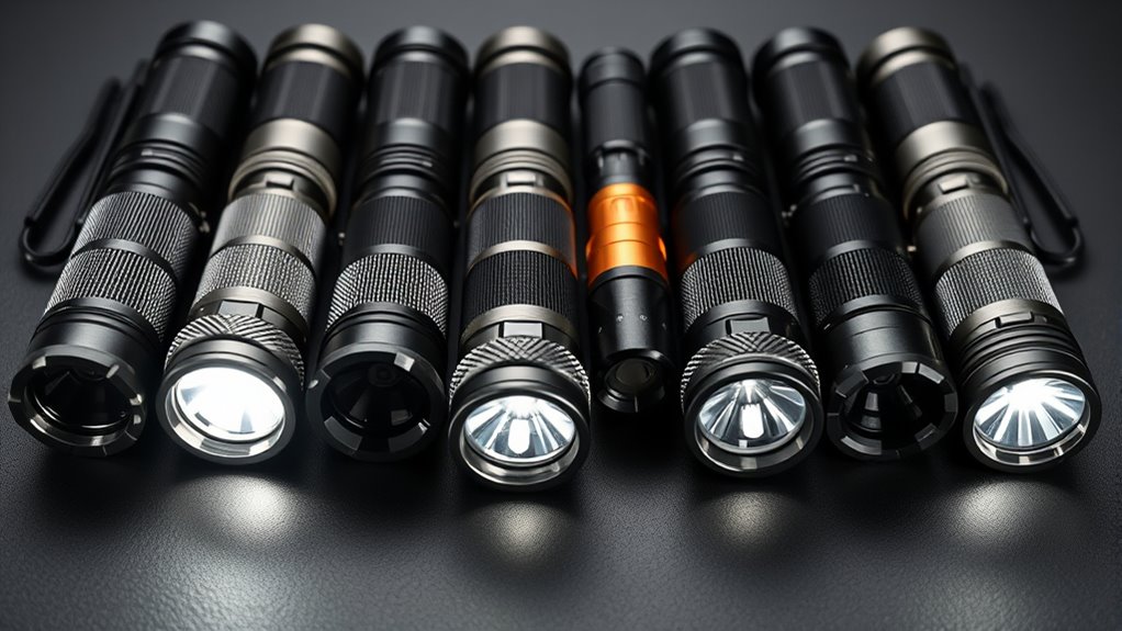 A zoom or focus feature boosts versatility, letting you switch between a narrow spotlight and a wide floodlight. Balancing brightness and beam distance guarantees your flashlight suits any tactical or outdoor situation.