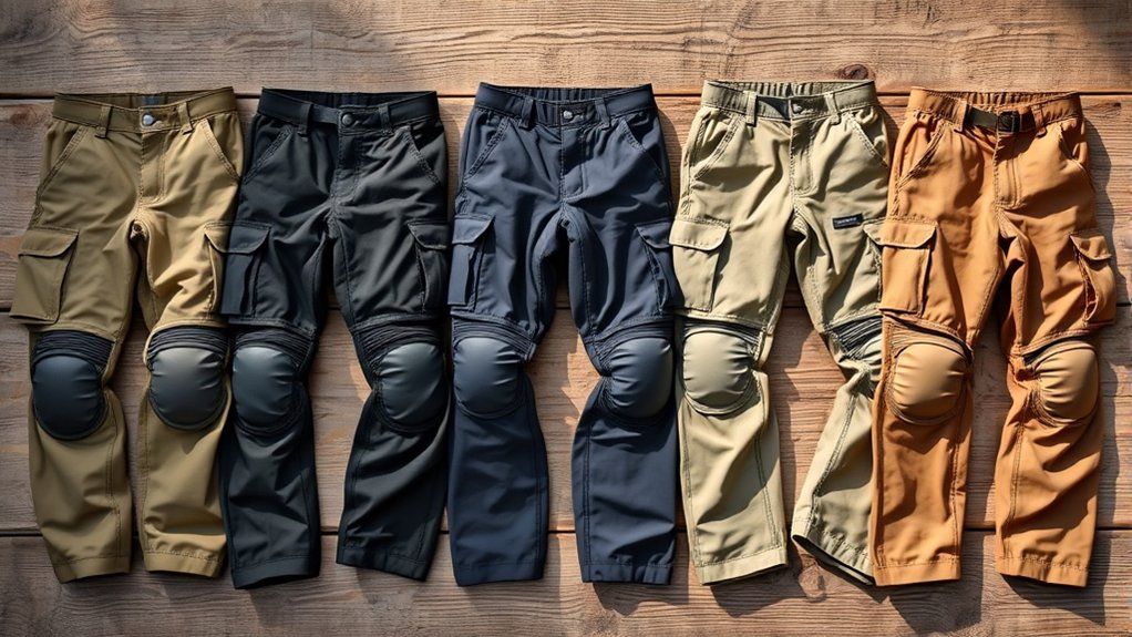 Pockets should secure your gear while knee pads provide extra protection. Brands like IDOGEAR, TACVASEN, and 5.11 offer top choices combining these features. Keep going to discover the best options tailored for your 2026 gameplay needs.