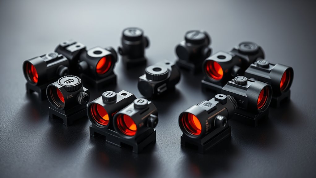 Additionally, multi-coated lenses and scratch-resistant surfaces maintain clear optics over time. Pay attention to sealed housings and reinforced mounts, as these build-quality elements boost both longevity and weather resistance, making sure your red dot stays reliable no matter the environment.