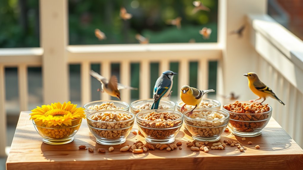 Smaller seed-eaters prefer finer blends with smaller, efficient seeds, while larger species thrive on bigger seeds and heftier blends. You should offer a mix tailored to each group: a chickadee-relevant blend with nyjer, millets, and small sunflower parts for tiny birds, and a separate mix featuring safflower, sunflower, and larger seeds for bigger species.