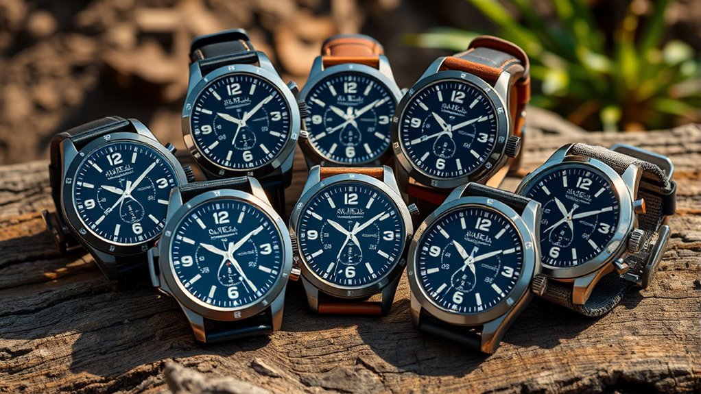 The dial’s crystal should be scratch-resistant sapphire or mineral glass, guaranteeing clear visibility and long-lasting protection. A well-sealed casing with gaskets keeps dust, moisture, and debris out, preserving your watch’s functionality. Additionally, robust mounting mechanisms and reinforced buttons guarantee reliable operation, even in rugged environments.