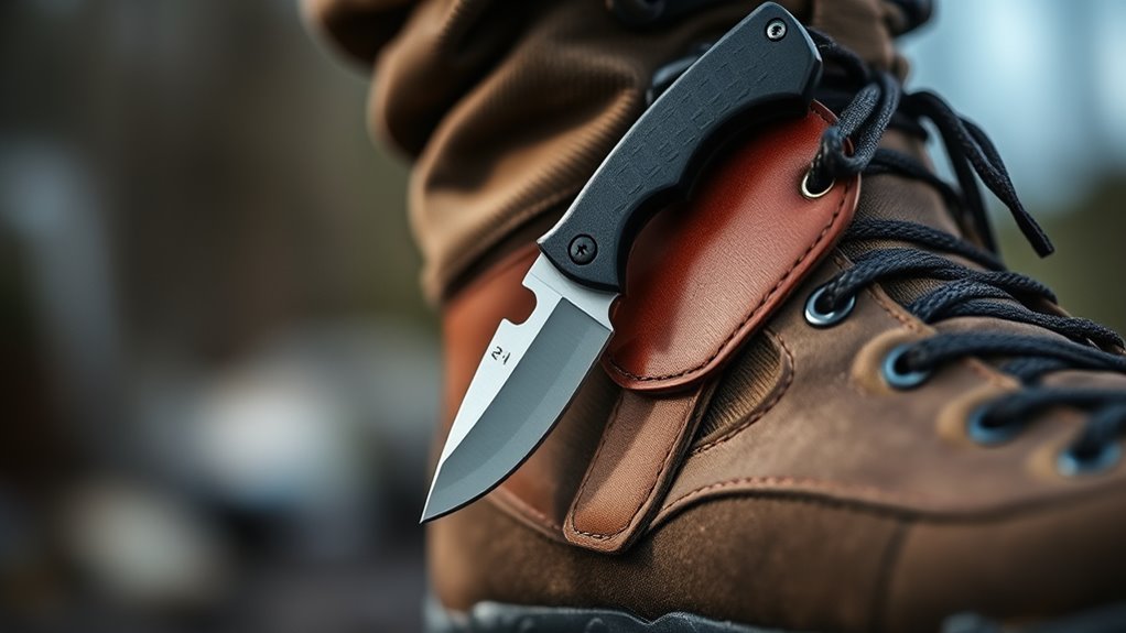 A well-designed sheath allows silent, smooth removal, keeping you discreet and avoiding unwanted attention. Placement matters too; your knife should sit where you can reach it naturally without awkward bending or shifting. Finally, the knife and sheath must fit your ankle comfortably for easy concealment and access, ensuring you’re always ready without sacrificing comfort or stealth.