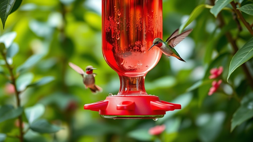 To keep nectar fresh and prevent messy spills, you’ll want a hummingbird feeder with reliable leak-proof features. Look for sealed lids and thickened gaskets that create a tight seal, stopping nectar from leaking during hot weather or when birds are active.