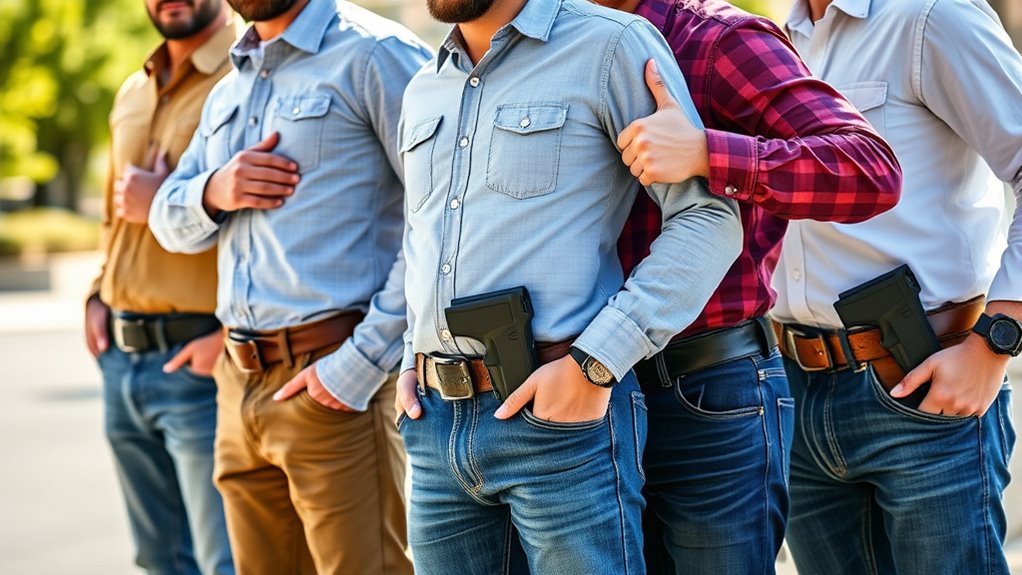 Look for holsters with flexible closures like Velcro or snaps—they let you make easy adjustments throughout the day, ensuring a secure yet comfortable fit. These features help you carry confidently without sacrificing comfort or accessibility.