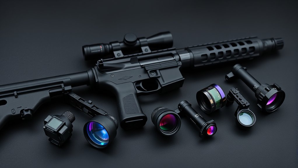 Reticle size, measured in MOA, impacts precision—smaller sizes like 2MOA help with long-range accuracy. Multi-reticle sights offer flexibility, letting you switch quickly between reticle types for different distances or tactical needs. Don’t forget parallax correction; it guarantees your aim stays true regardless of eye position, which is critical for precise shots at varying ranges.