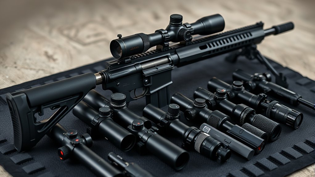 Don’t overlook components like zero-reset turrets and side parallax adjustments—they maintain accuracy and streamline sighting. Finally, check for compatibility with various mounting options and included tools to guarantee smooth installation on your AR-15.
