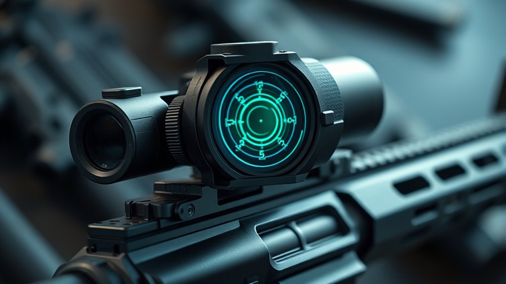 Choosing from a variety of reticle types can substantially impact your shooting experience with an AR holographic sight. You’ll find reticles in red or green, with some models letting you switch between both for added versatility. Many sights offer multiple reticle shapes—dots, circles, or combinations—so you can pick what matches your shooting style best.