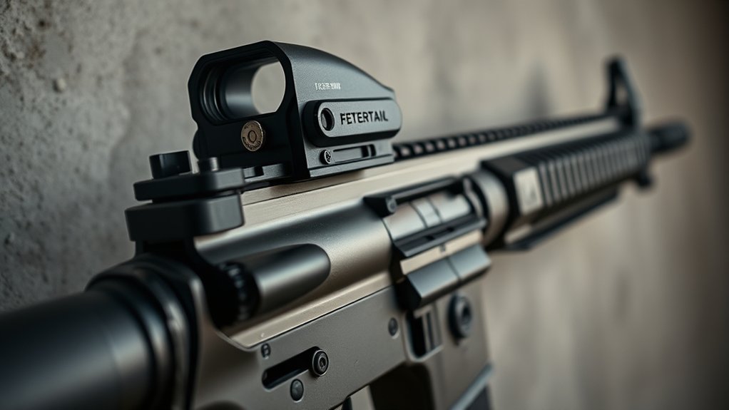 Ultimately, verify that the flip-up sights won’t interfere with other rail accessories like optics or laser mounts, ensuring everything works harmoniously. Prioritizing these compatibility factors helps you maintain accuracy and reliability in the field.