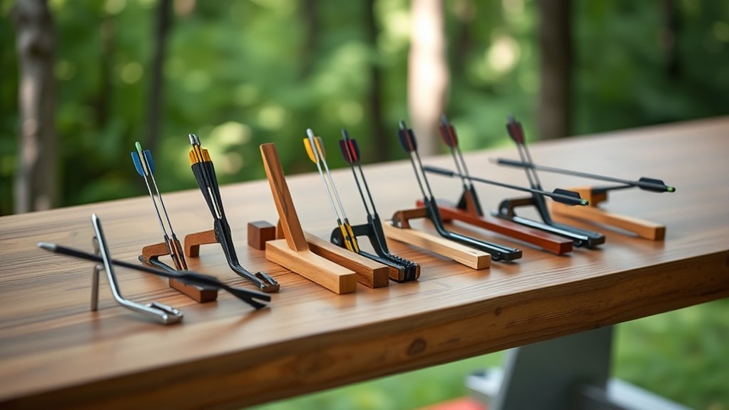 Being able to modify the rest’s angle and tension also helps you accommodate different arrow sizes and shooting styles effortlessly. Many adjustable rests use magnetic rebound or screw-based mechanisms, making tuning secure and straightforward. By choosing an arrow rest with these features, you guarantee it fits your unique preferences, which directly improves your overall shooting performance and helps you get the most from your recurve bow.
