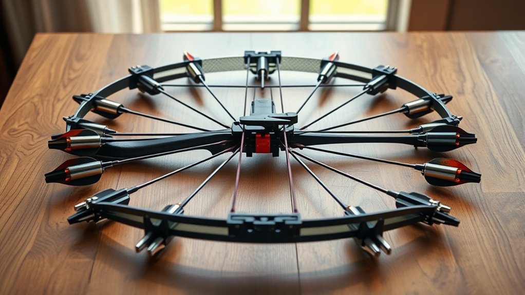 Don’t forget to verify the mounting system aligns with your bow’s riser and mounting holes. This ensures easy installation. Finally, look for adjustable features tailored to your bow type, allowing you to fine-tune the rest for consistent arrow flight and better overall performance. Compatibility is key to maximizing your shooting experience.