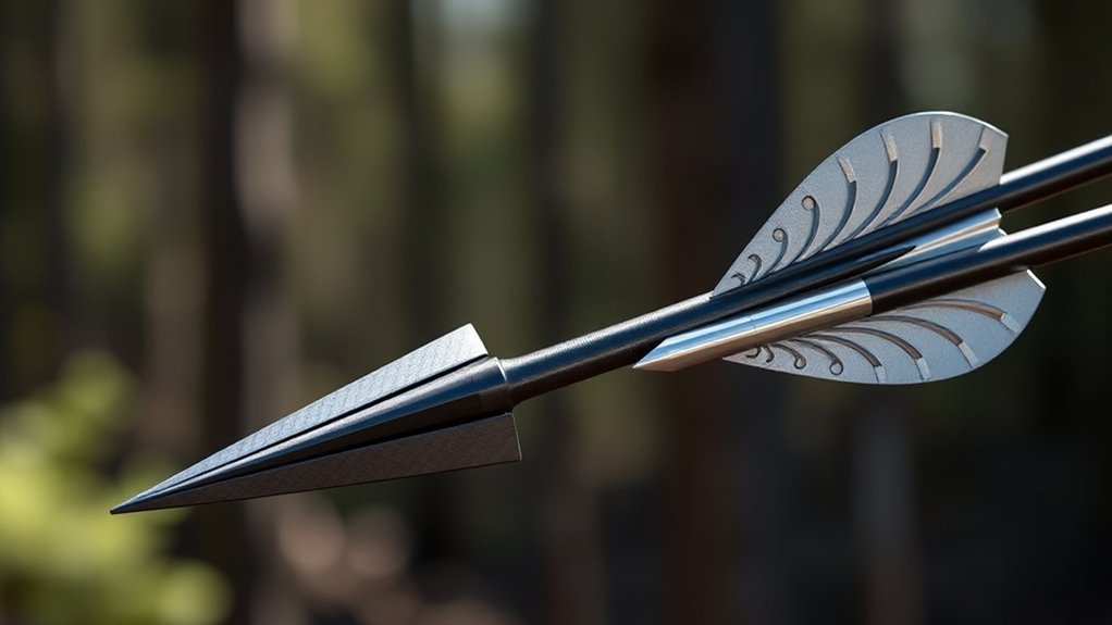 The tip shape, such as needle-point or chisel-point, impacts your arrow’s ability to pierce thick hide and muscle effectively. Use tips made from durable, corrosion-resistant materials like stainless steel or high-quality aluminum, which stay sharp through multiple shots. Additionally, find a design that balances sharpness with safety to prevent accidental injuries during handling and transport, making your arrow both effective and safe.