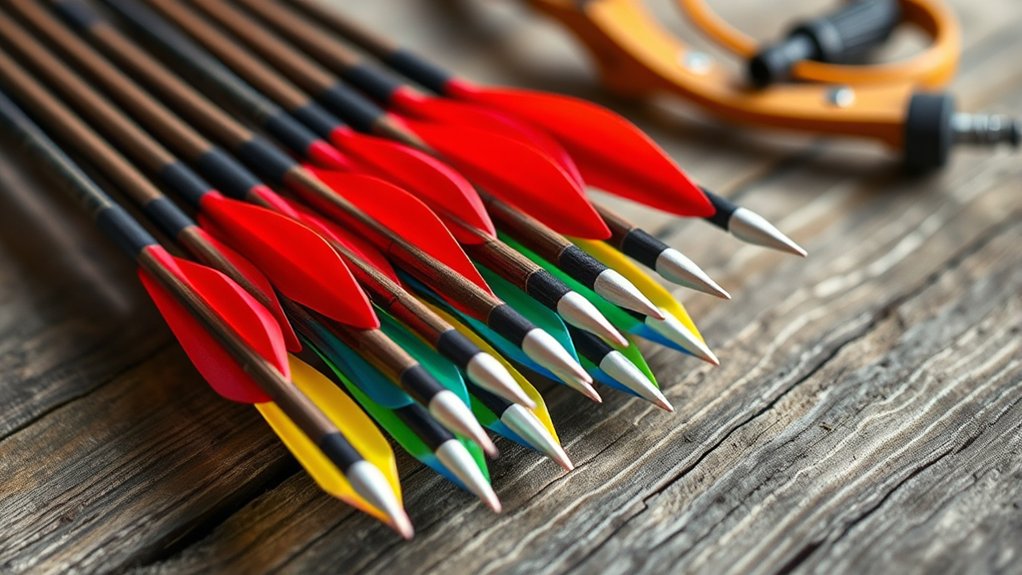 To get the best results, choose arrows with a spine rating that matches your bow’s draw weight and draw length. This guarantees your arrows flex properly, improving accuracy, consistency, and safety every time you shoot.