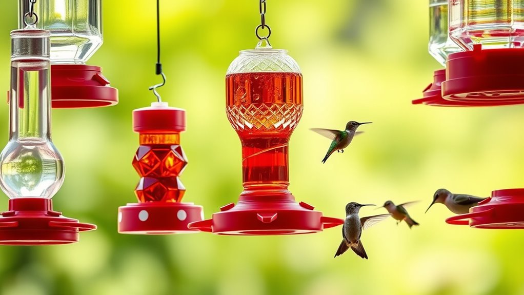 Aesthetic appeal matters just as much as function, since a visually striking feeder can enhance your outdoor space while attracting more hummingbirds. When you choose, consider decorative glass, embossed designs, or vibrant colors to boost visual impact. A well-made feeder with natural motifs or bright hues, such as red, can also serve as a charming garden ornament.
