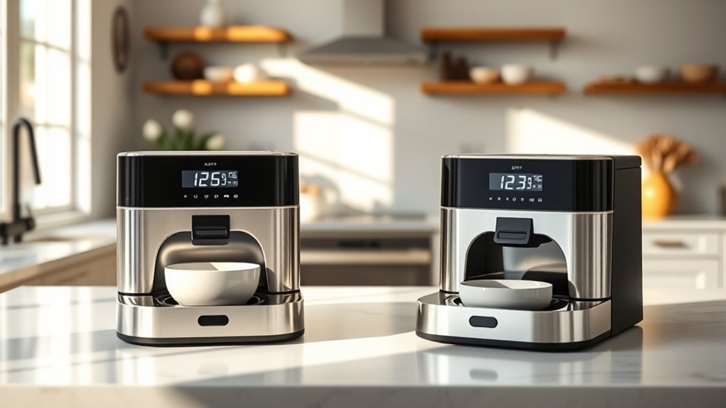 When choosing an auto cat feeder for two cats, prioritize safety features that prevent accidental access, malfunctions, and electrical hazards. Look for secure lid locks and tamper-proof design to stop pets from stealing food. Safety sensors, like infrared detection, help prevent overfeeding and dispensing errors that could harm your cats.