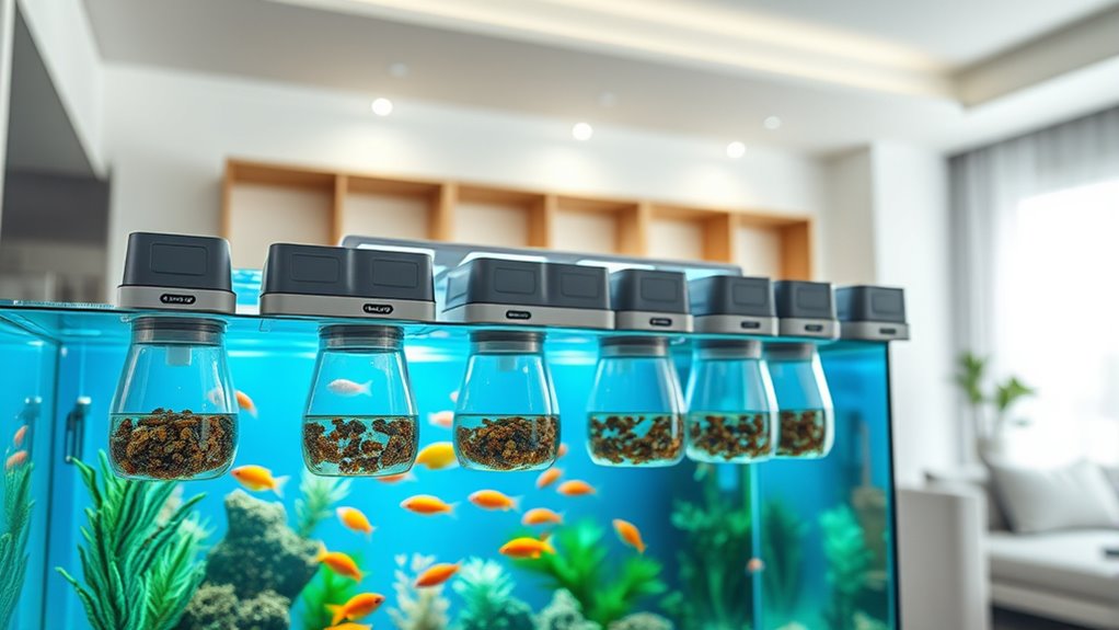 You’ll appreciate models with magnetic housings and quick-release lids for easy maintenance. Don’t worry about disturbing fish or nocturnal feeders; these run smoothly, letting you rest easy and keep your aquarium privacy intact. It’s a win-win when it stays quiet and reliable.