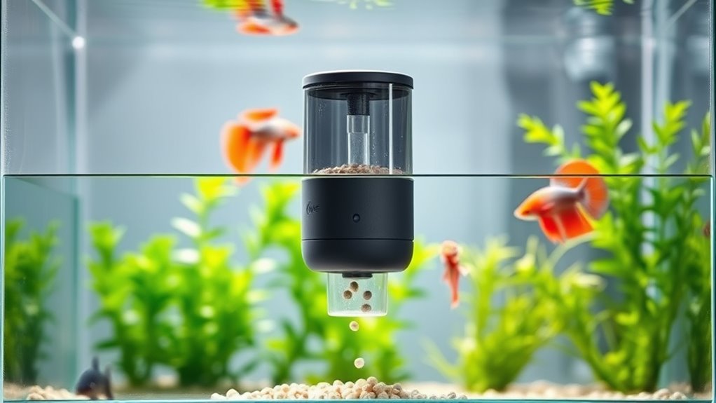 Portion control precision is essential for healthy, stable betta care. You want an automatic feeder with adjustable sliders or gears so you can customize portions per feeding, ensuring consistency. Accurate portioning helps prevent overfeeding, which can harm water quality and your betta’s health.