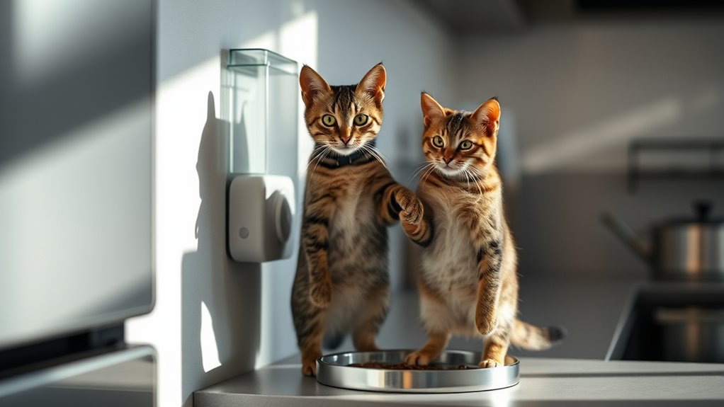 Feeding management features let you tailor meals to each cat’s needs with precision. You’ll see personalized schedules thanks to RFID or microchip identification, so the feeder recognizes every pet. Remote scheduling and portion control via a mobile app let you adjust timing and quantities with confidence.