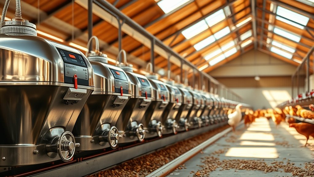 Match capacity to flock size to prevent shortages or excess, avoiding waste and stress among birds. Remember, capacity directly affects cost: bigger models cost more upfront but can save money by reducing refills over time. Selecting the right capacity helps ensure a steady feeding routine and minimizes the risk of feed running out during critical moments.