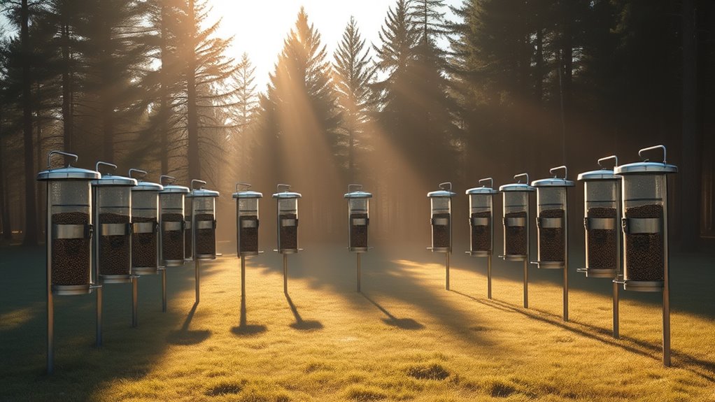 Dispatch mechanisms determine how your feeder distributes feed and can considerably impact waste, coverage, and wildlife interaction. You’ll choose among spin plates, gravity feeders, or directional dispersers, each with distinct delivery methods. Spin plates rotate to broadcast feed in all directions, delivering 360-degree coverage, while gravity feeders rely on a simple downward flow.