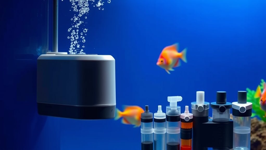 A secure, stable mounting system prevents displacement or spills during operation, protecting your tank inhabitants. Consider whether the design allows easy refilling without disassembly, so you won’t juggle parts mid-feed. Finally, guarantee the process is straightforward, with clear instructions and minimal tools required.