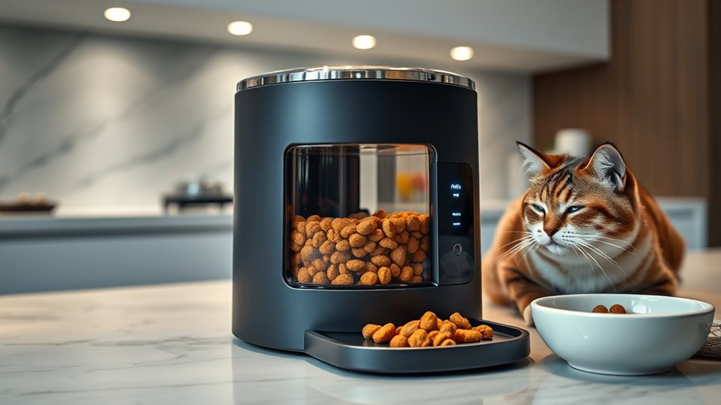 Some feeders include refrigeration systems that actively cool and preserve wet food, extending freshness up to 3-4 days. Proper preservation methods help prevent bacterial growth and spoilage, ensuring safe, nutritious meals for your pet.