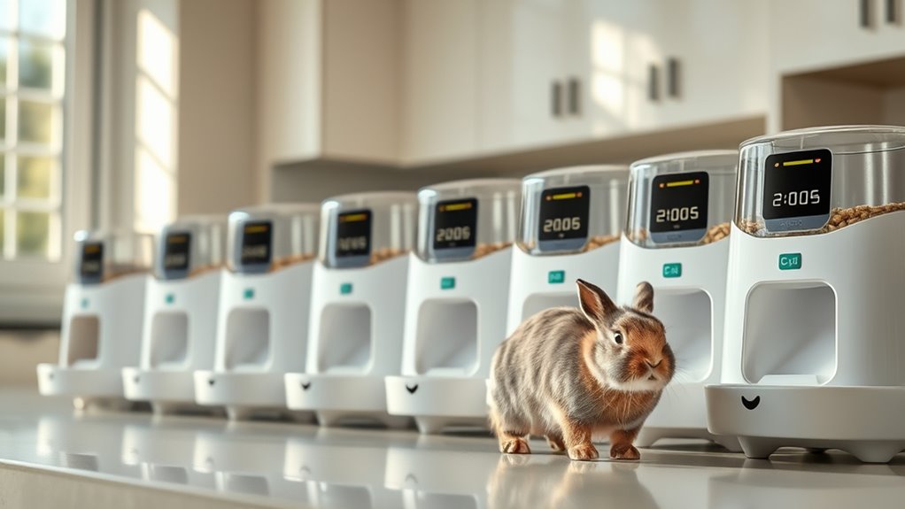 When selecting an automatic rabbit feeder, consider capacity and portioning to fit your bunny’s daily needs, so you won’t worry about overfeeds or waste. Look at power and connectivity options to guarantee it runs reliably, even during outages or when you’re away.