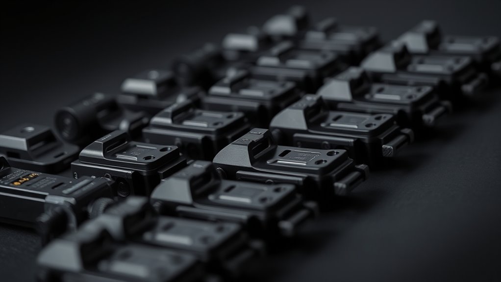 Three main deployment mechanisms dominate the backup iron sight market: spring-loaded, manual flip-up, and automatic folding systems. If you want rapid deployment, spring-loaded sights are ideal—they pop up quickly with a simple push, getting you ready in seconds.