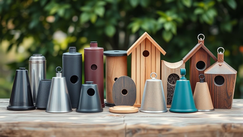 Choosing the right material for your bird house baffle can make all the difference in its durability and performance. You’ll want to pick weather-resistant options like polypropylene, metal, or heavy-duty plastic, as these withstand outdoor elements without cracking, rusting, or fading. Materials with UV resistance and strong impact tolerance guarantee your baffle stays intact despite sun exposure, rain, snow, or wind.