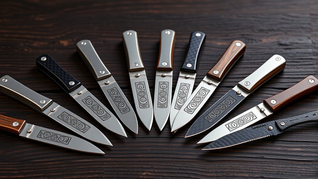 The blade shape, such as sheepsfoot or drop point, affects balance and handling, so pick one that suits your style. Furthermore, coatings like Teflon or acid-wash finishes can boost corrosion resistance and add aesthetic appeal without compromising blade integrity.