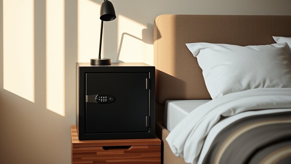 Some safes also offer backup keys or USB ports for emergency power. Regularly replacing batteries guarantees your safe stays reliable and ready when you need it most.