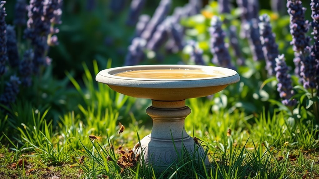 Water depth safety is essential for bees and other tiny visitors, so aim for a shallow bath that’s easy to land on and hard to drown in. Keep water between 0.25 and 0.5 inches for small pollinators like bees and butterflies. Not too deep reduces drowning risk and makes landing simpler, inviting more critters to bathe and drink.