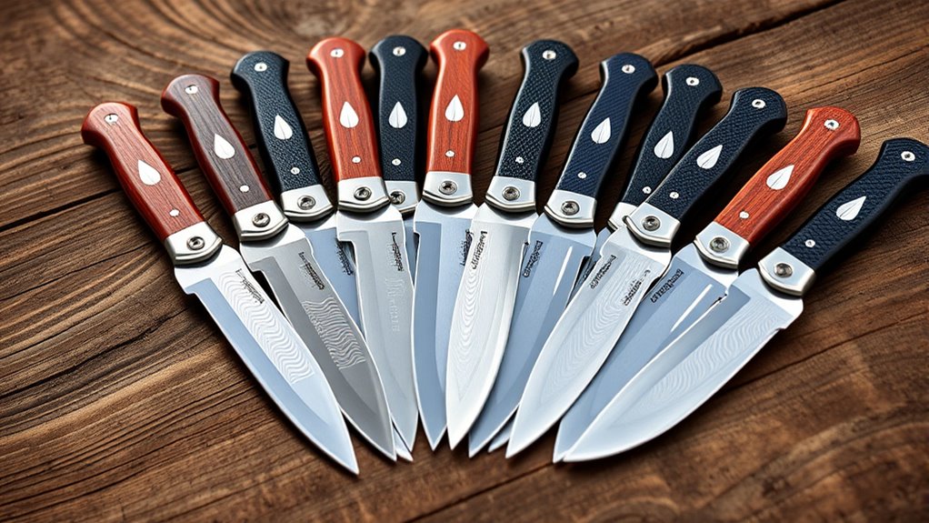 These super steels also enhance toughness, minimizing chipping or breaking during tough tasks. Stainless options generally need less frequent sharpening and are easier to clean, saving you time in the field. Additionally, the blade’s finish—such as stonewash or satin—affects scratch resistance and overall durability, helping your knife withstand rugged conditions.