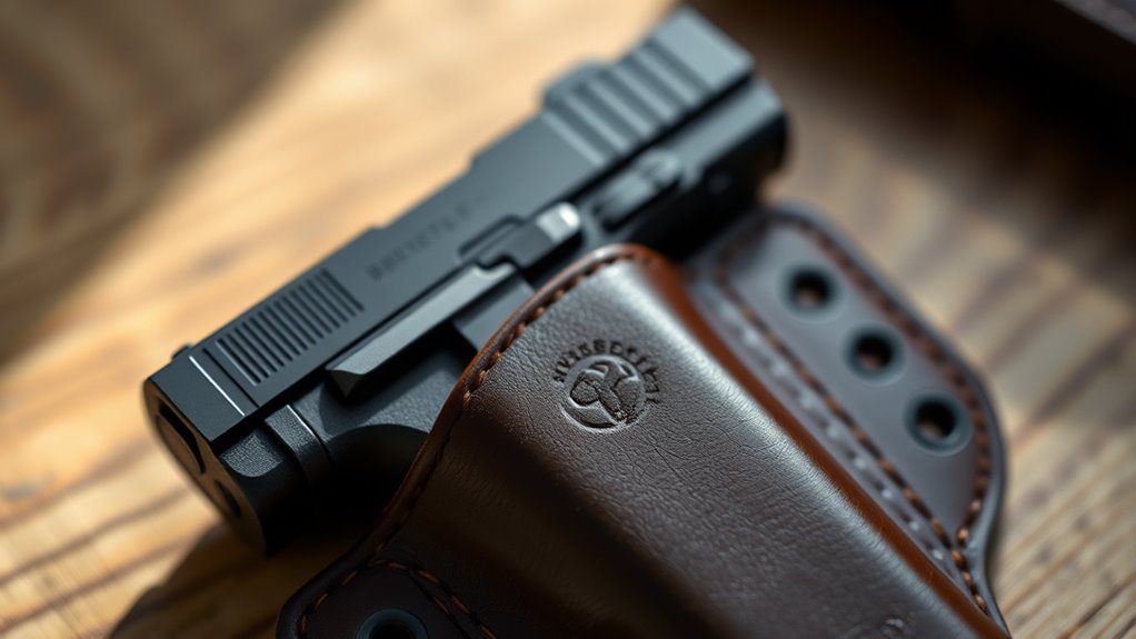 The holster’s profile matters too—thinner, slim-fitting designs made from materials like Kydex or leather reduce bulk and visibility. Proper positioning on your body also plays an essential role; slight adjustments can notably improve concealment depending on your carry style.