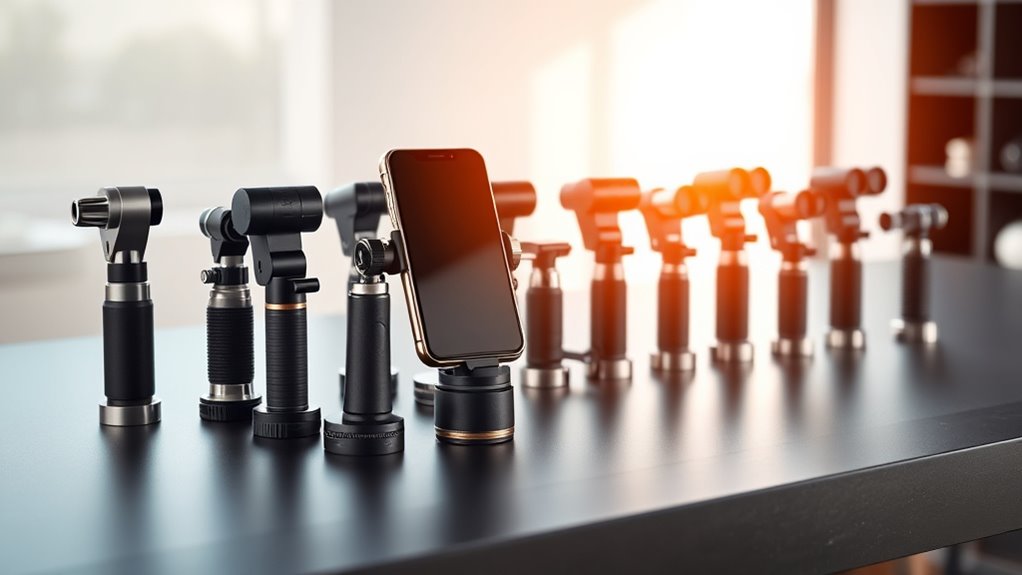 A 360° rotatable adapter gives you the flexibility to switch easily between vertical and horizontal shots. Make sure it includes a secure locking system to prevent shifts during use, keeping your images consistently sharp. Adjustable phone clamps and alignment knobs are also key—they let you accommodate different phone sizes and camera placements, ensuring stable, accurate captures every time.